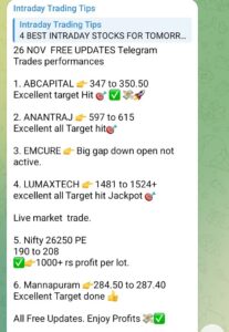 Friends in this post I will provide Best Intraday stocks for 27 Nov . Before Giving the stocks I want tell you about our Pre trading strategy to get profits almost 90 to 95% correctly. You can join our Telegram Channel subscribe our YouTube channel and follow our Instagram page to get more details about the strategy. Because this is one of the best strategy.